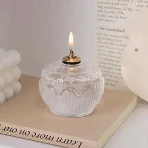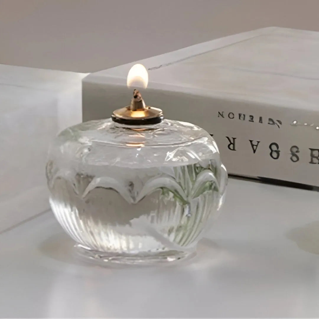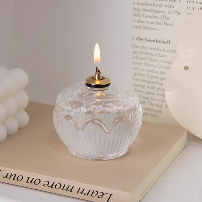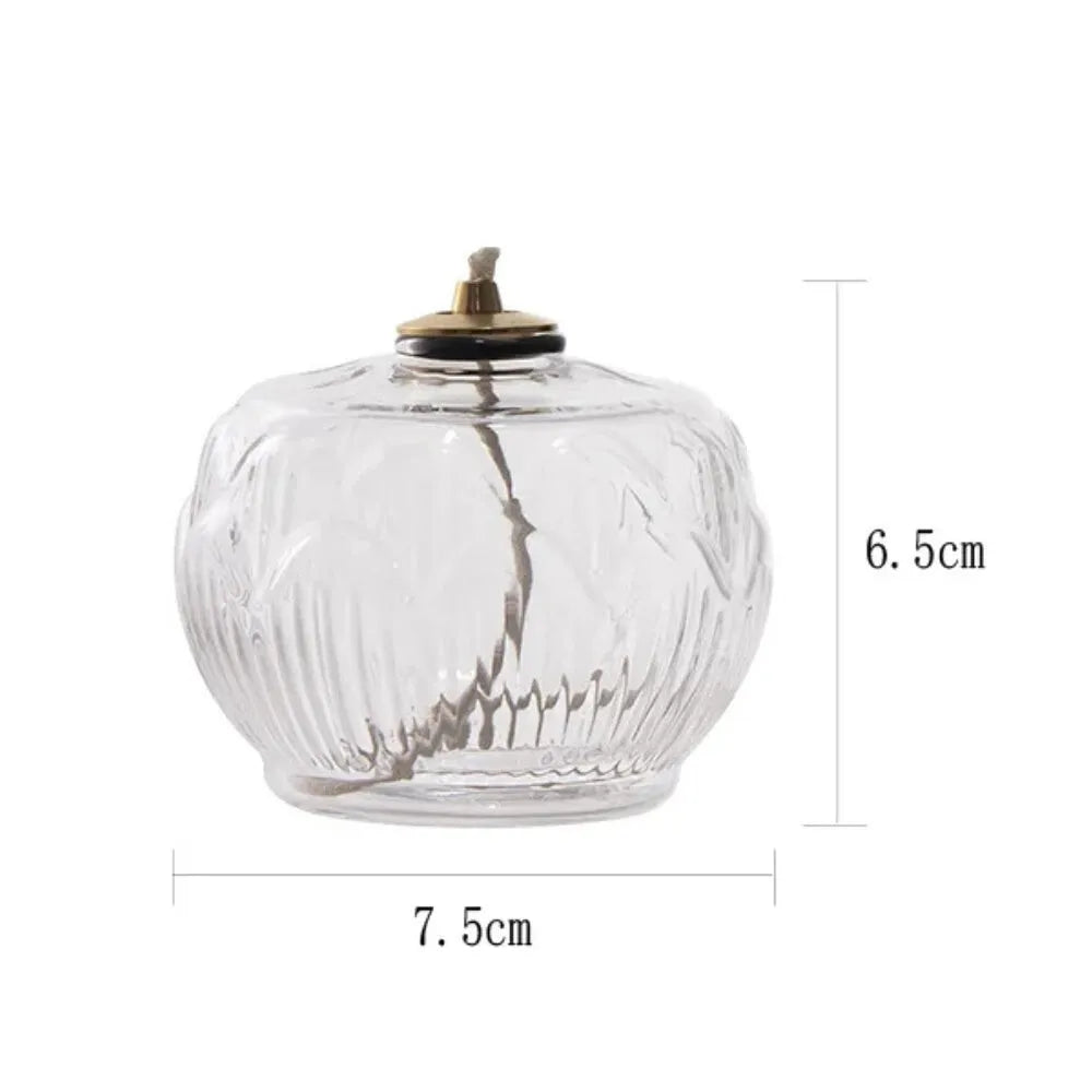 Globe lampe à huile en verre, compacte et élégante, idéale pour créer une ambiance chaleureuse et décorative.