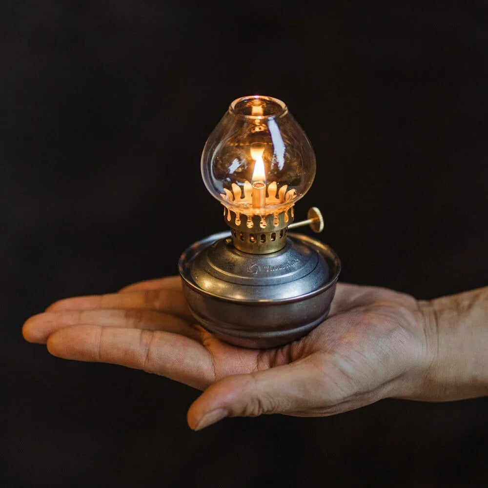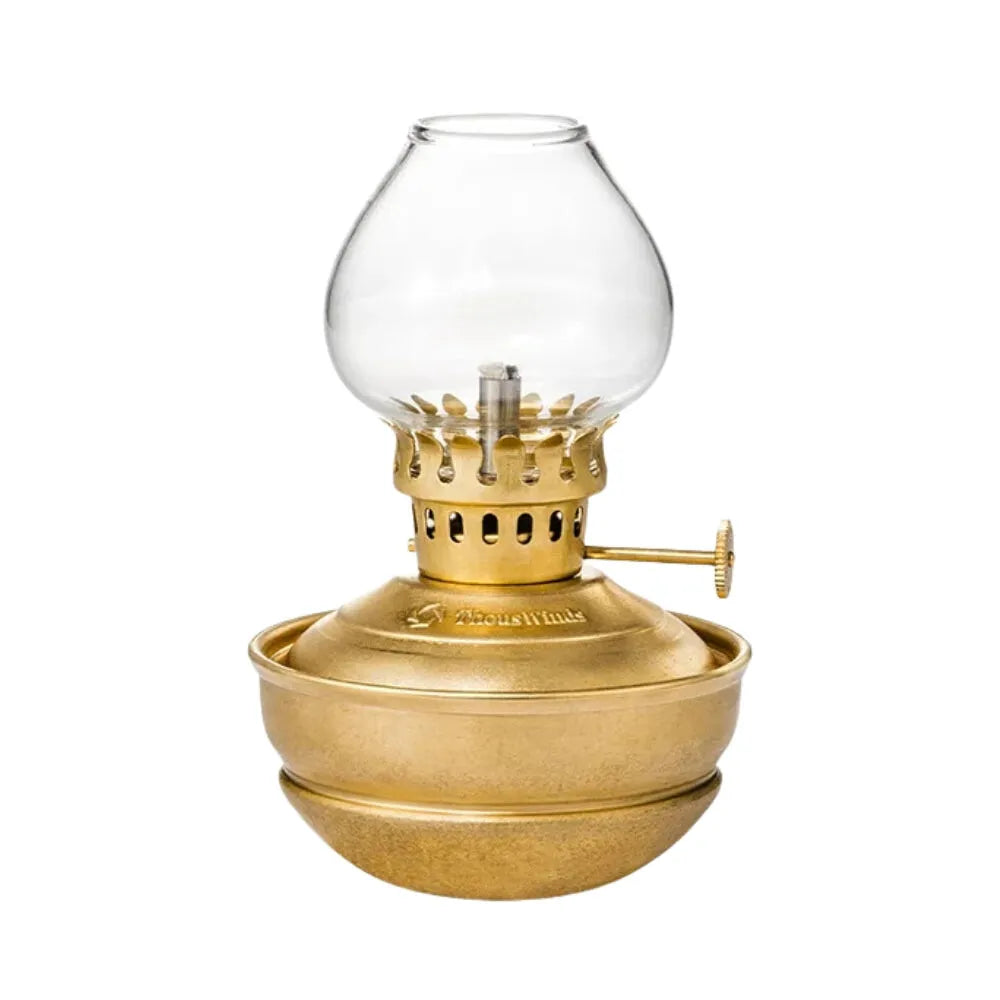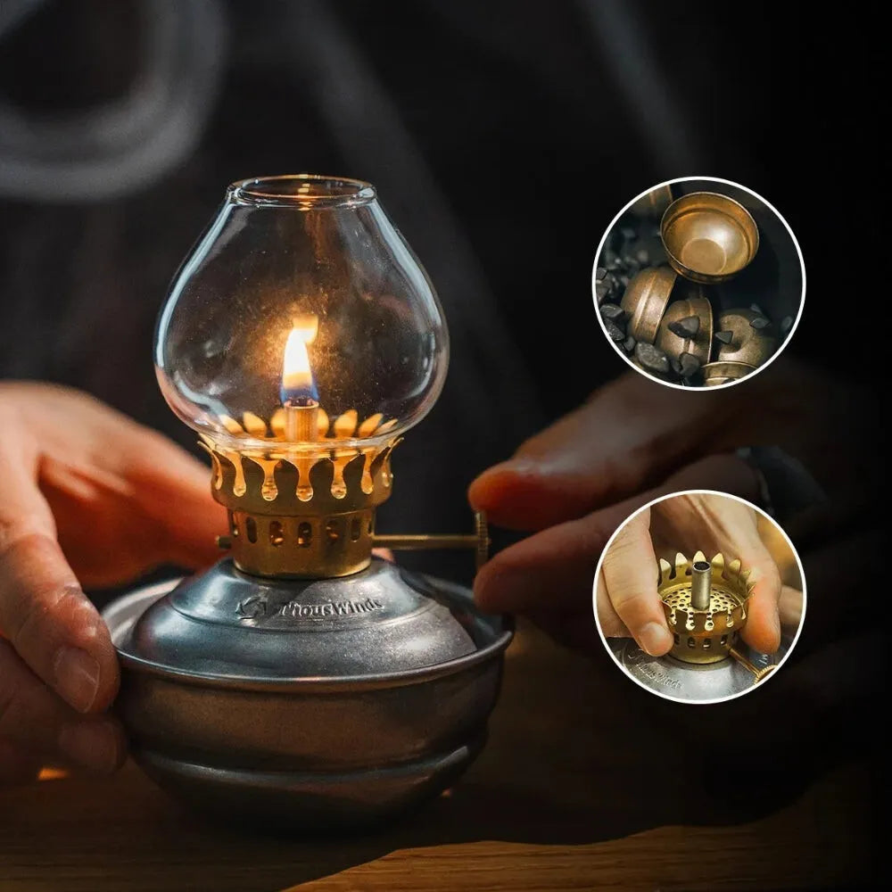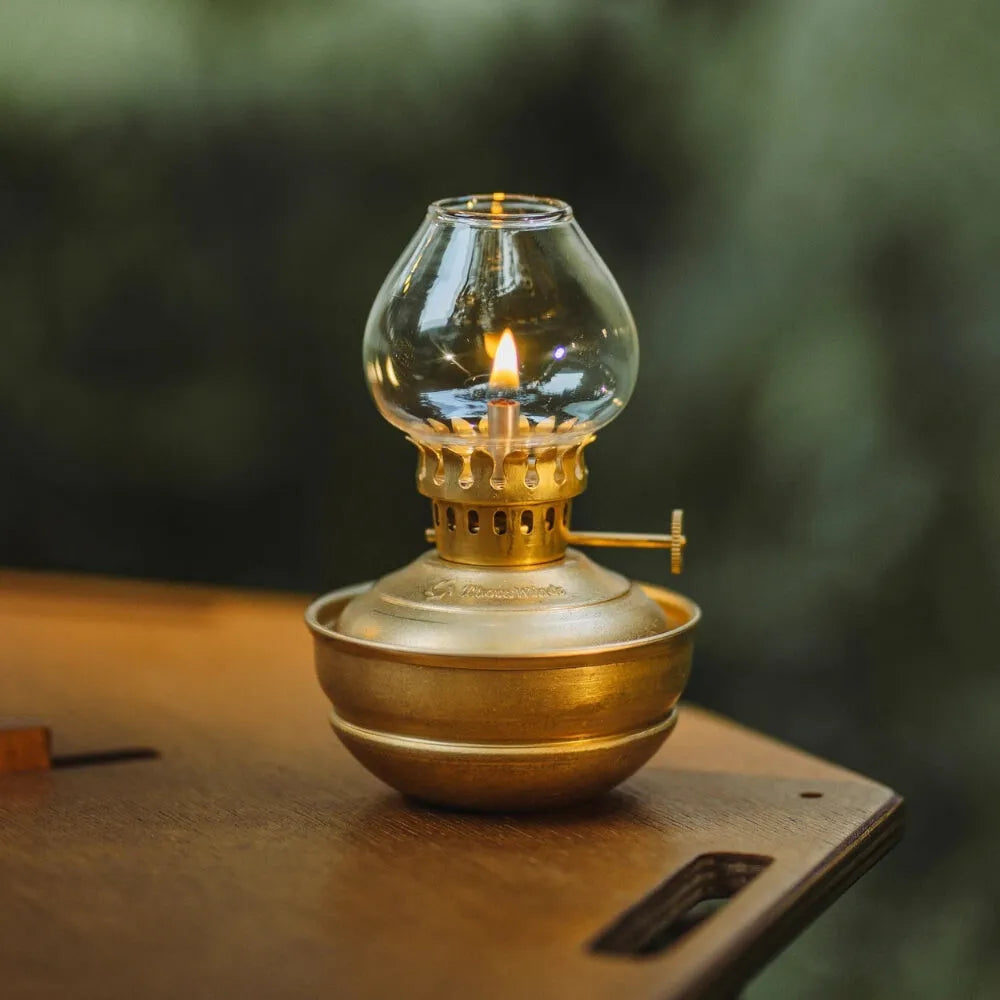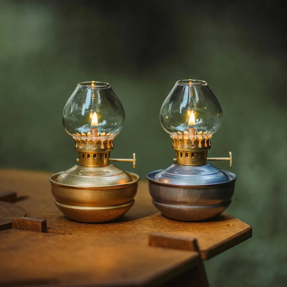Lampe à huile style bronze, compacte et sans électricité, idéale pour créer une ambiance chaleureuse et rétro en toute simplicité.